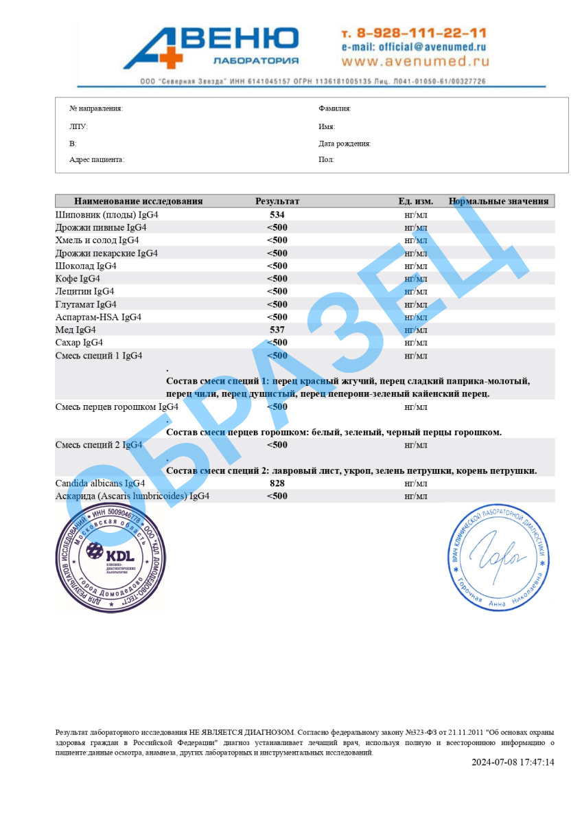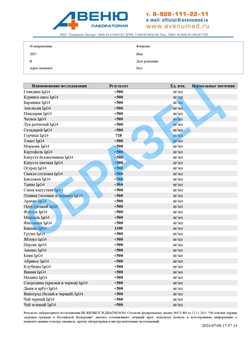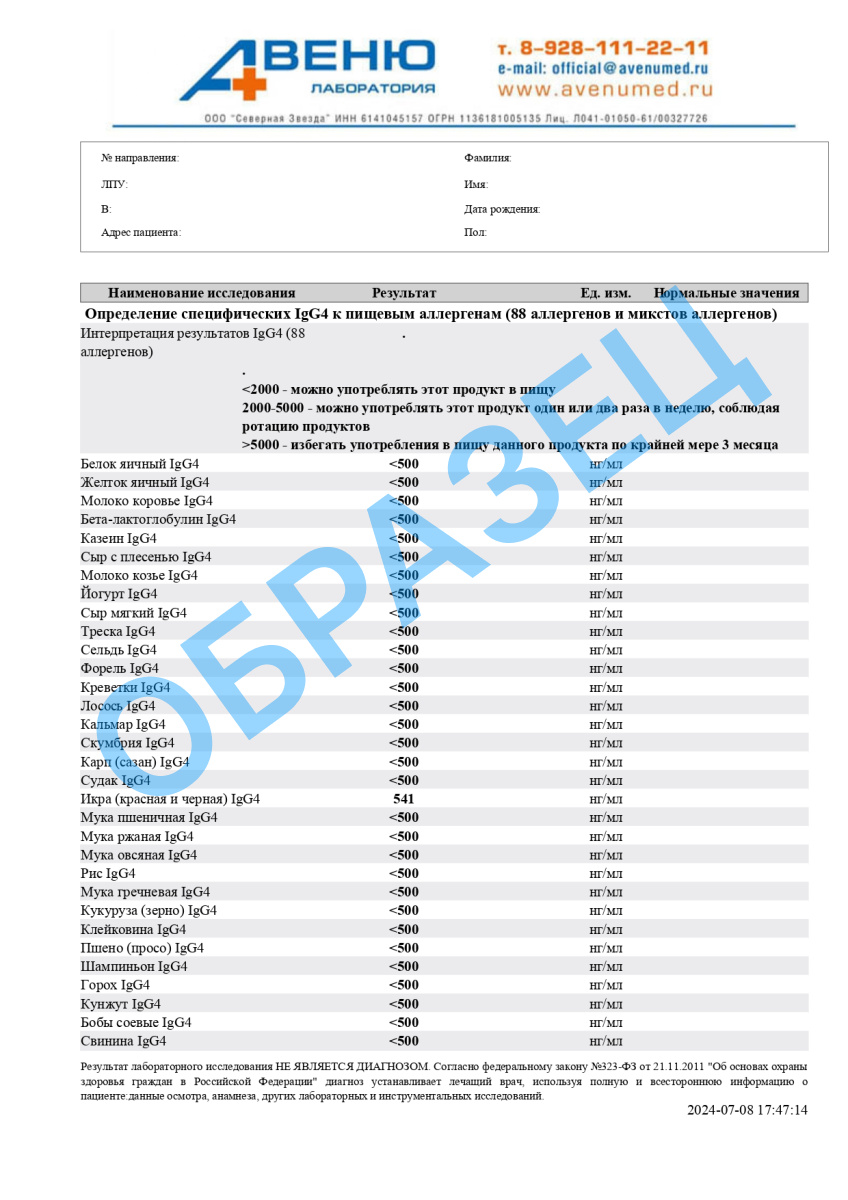 IgG4 к пищевым аллергенам (пищевая непереносимость - 88 аллергенов/микстов), количественно