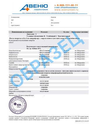 Комплексное исследование мокроты (БАЛ): посев на микрофлору с определением чувствительности к основному спектру антибиотиков и микроскопия мазка
