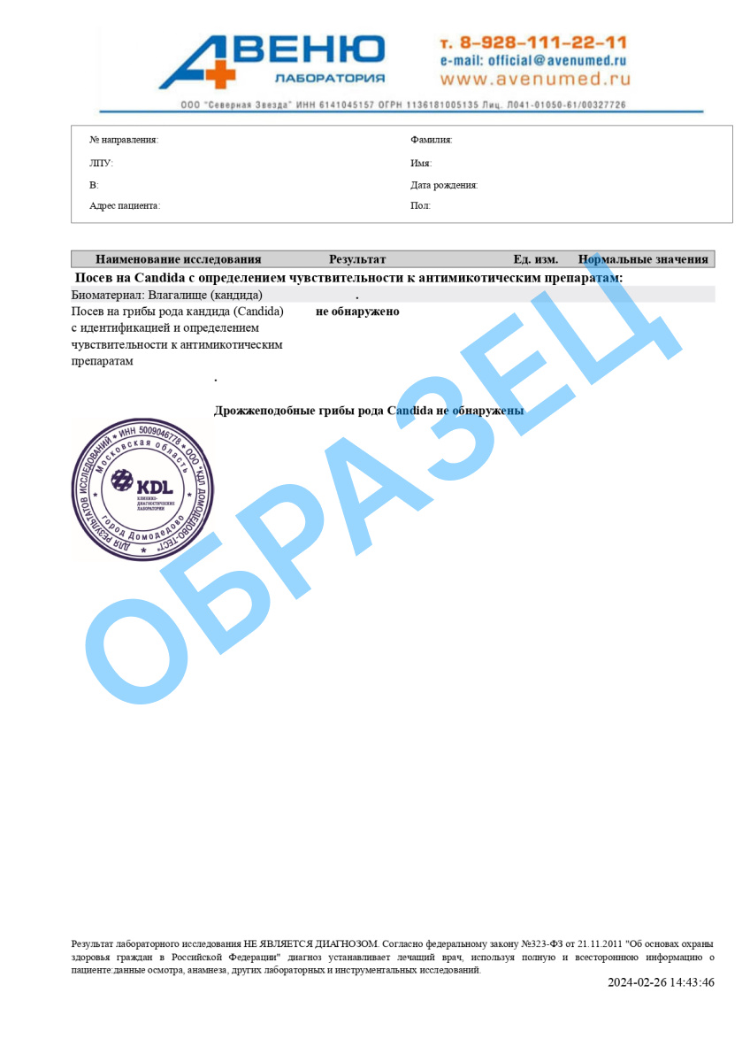 Посев на грибы рода кандида с идентификацией и определением чувствительности к антимикотическим препаратам