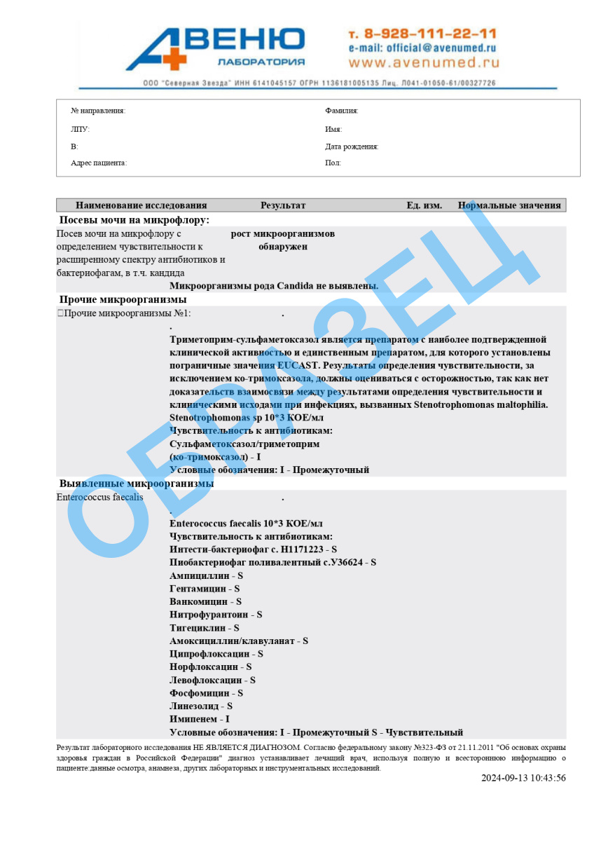 Посев мочи на флору с определением чувствительности к расширенному спектру антибиотиков и бактериофагам, в т.ч. Кандида