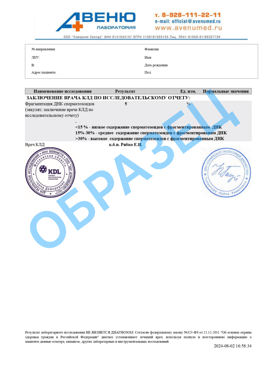 <15 % - низкое содержание сперматозоидов с фрагментированным ДНК