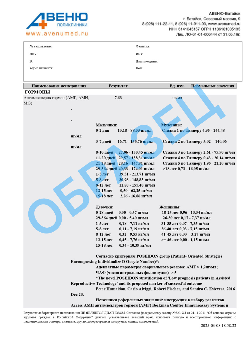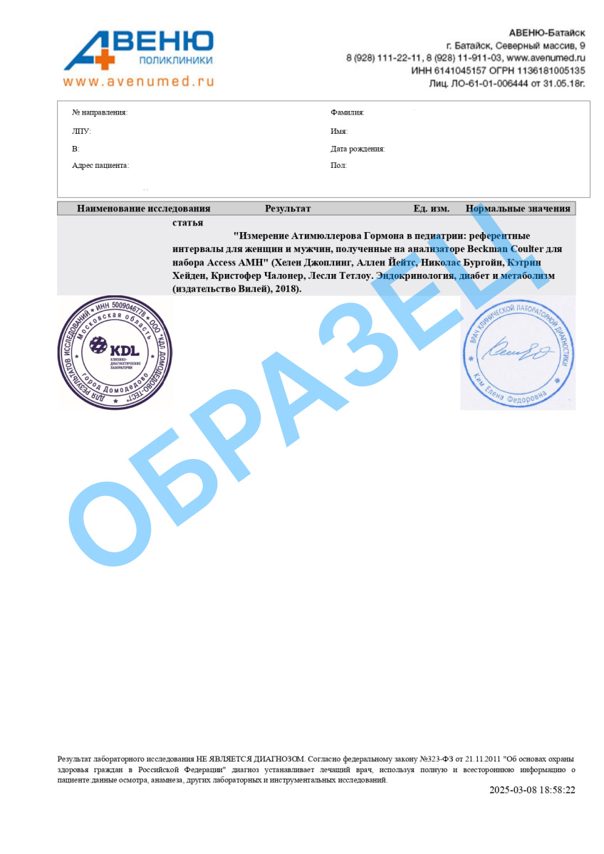 Сдать анализ на антимюллеров гормон можно в поликлиниках АВЕНЮ в Ростове-на-Дону — это максимально удобно, конфиденциально и по выгодной цене. Спустя 4 дня вы получите результат высокой точности.