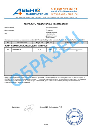 Результат лабораторного исследования не является диагнозом. Согласно федеральному закону №323-ФЗ от 21.11.2011 (ред. от 29.07.2017) «Об основах охраны здоровья граждан в Российской Федерации» диагноз устанавливает лечащий врач, основываясь на всестороннем обследовании пациента: сбор и анализ жалоб, данные анамнеза и осмотра, проведение лабораторных, инструментальных и иных исследований.