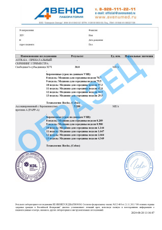 Биохимический скрининг I триместра беременности для программы ASTRAIA (без расчета рисков патологии плода) (8 недель - 13 недель 6 дн.): ассоциированный с беременностью протеин А (PAPP-A), свободная субъединица бета-ХГЧ