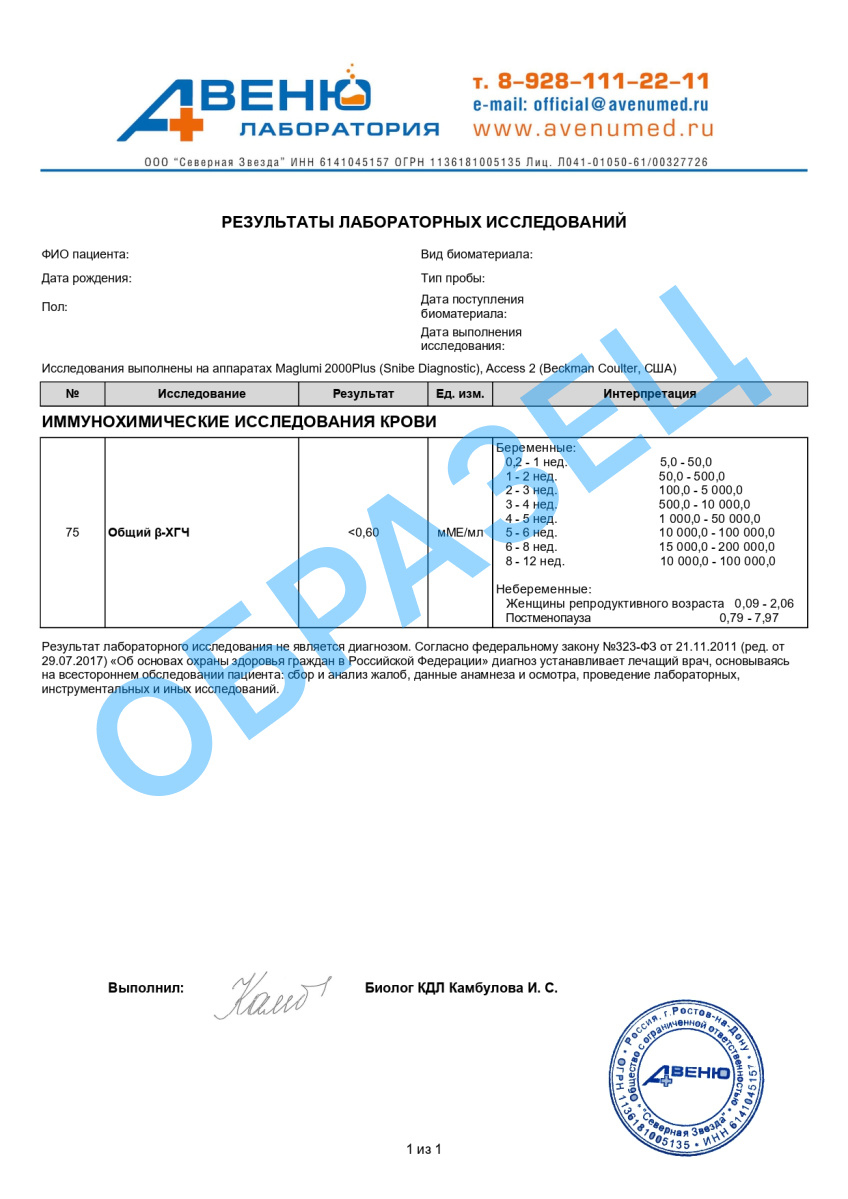 В медцентрах АВЕНЮ (Ростов-на-Дону) можно сдать анализ на ХГЧ (общий). Низкая стоимость процедуры. Нажмите, чтобы узнать сколько стоит анализ на общй ХГЧ.