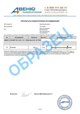 Разъяснение результатов анализов предоставляет важные сведения для доктора и не служит основанием для установления диагноза. Данные, полученные в ходе анализов, не должны применяться пациентами для самостоятельной диагностики или лечения. Окончательный диагноз определяется медицинским специалистом на основе комплексного анализа результатов данного исследования, а также истории болезни и данных из других диагностических процедур.