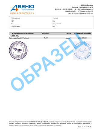 Тироксин (Т4) общий – это гормон, стимулирующий потребления кислорода и обмена тканей организма. Он вырабатывается клетками щитовидной железы при участии тиреотропного гормона (ТТГ). В норме, уровень общего Т4 составляет: у мужчин 59— 135 нмоль/л, у женщин 71—142 нмоль/л. Уровень гормона у мужчин и женщин остается постоянным на протяжении всего срока жизни.