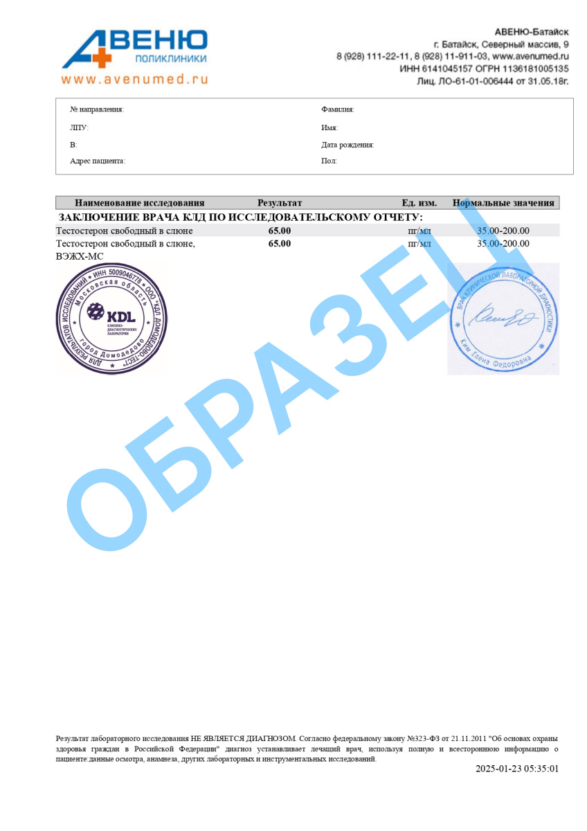Тестостерон свободный в слюне (заключение врача КЛД по исследовательскому отчету), количественно