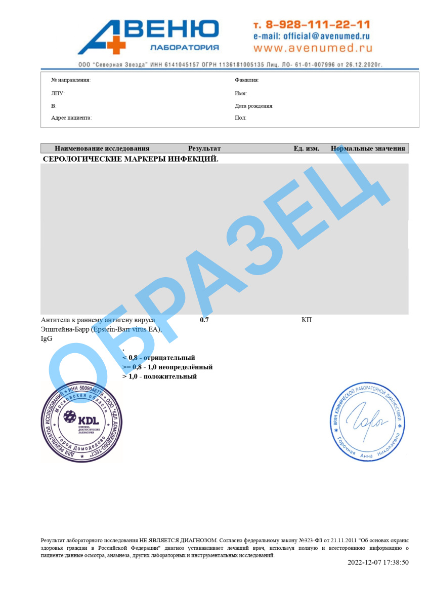 A26.06.030 Определение антител класса G (IgG) к ранним белкам (EA) вируса Эпштейна-Барр (Epstein-Barr virus) в крови