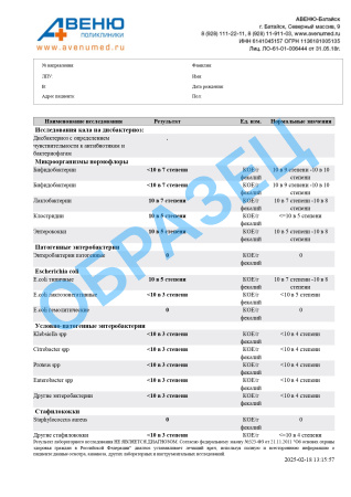 Дисбактериоз с определением чувствительности к антибиотикам и бактериофагам, количественно