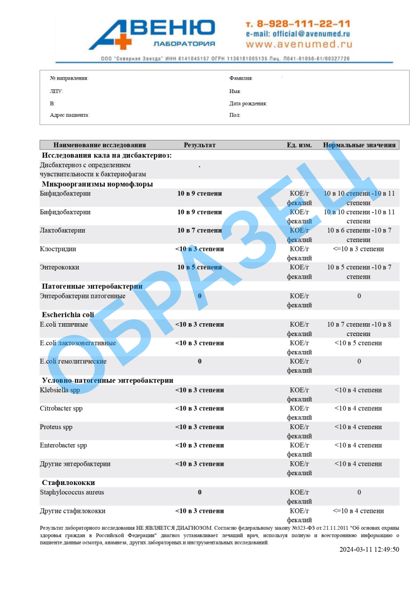Дисбактериоз с определением чувствительности к бактериофагам, количественно
