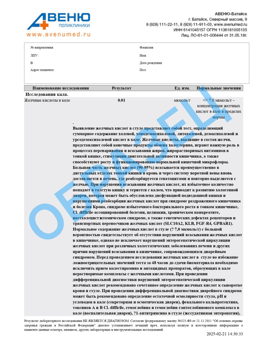 Разъяснение результатов анализов предоставляет важные сведения для доктора и не служит основанием для установления диагноза. Данные, полученные в ходе анализов, не должны применяться пациентами для самостоятельной диагностики или лечения. Окончательный диагноз определяется медицинским специалистом на основе комплексного анализа результатов данного исследования, а также истории болезни и данных из других диагностических процедур
