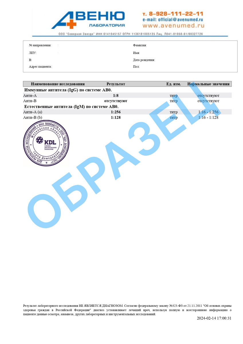 Антитела по системе АВ0 — это изогемагглютинины к антигенам A и/или B на эритроцитах. Определение антител по системе АВ0 имеет первостепенное значение для безопасности трансфузий: оно включает выявление антител и их количественную оценку (титр). Естественные антитела IgM формируются к отсутствующим антигенам, а антитела IgG появляются при сенсибилизации организма (после переливаний крови и во время беременности).