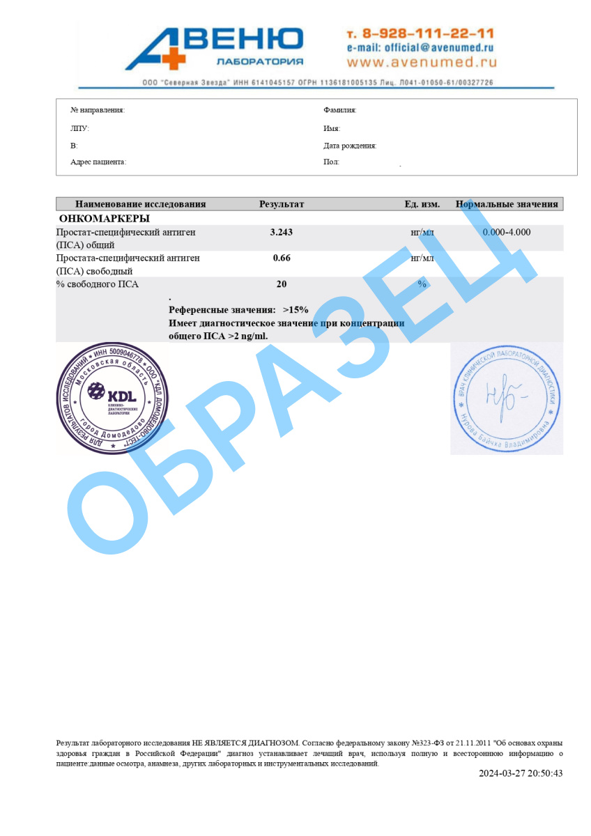 % Свободного ПСА (общий ПСА, свободный ПСА, и их соотношение)