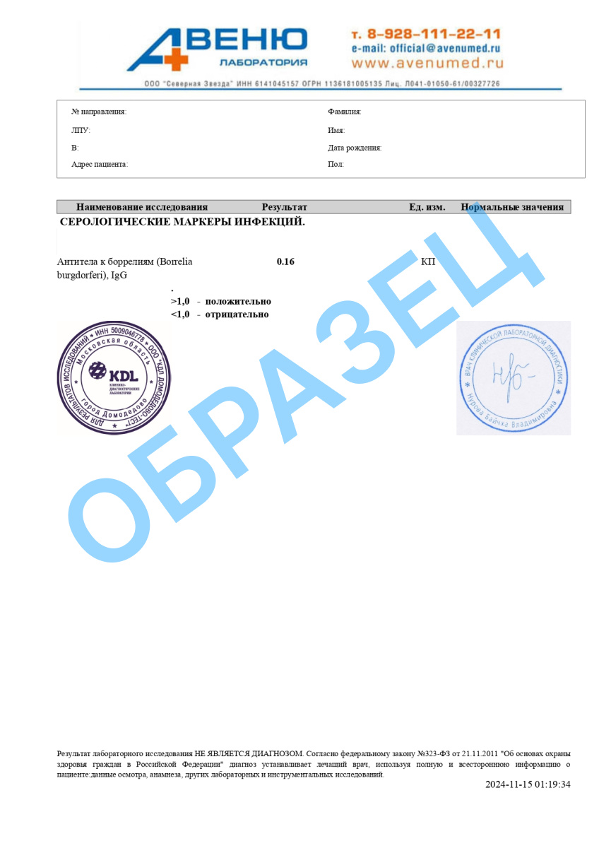 A26.06.011.002 Определение антител класса G (IgG) к возбудителям иксодовых клещевых боррелиозов группы Borrelia burgdorferi sensu lato в крови