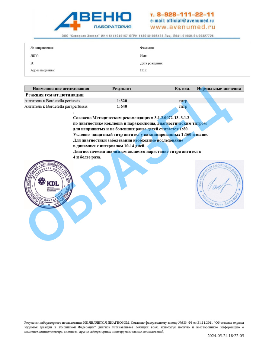 - АТ к возбудителям коклюша и паракоклюша (Bordetella pertussis, Bordetella parapertussis) суммарные (РПГА) полуколичественно