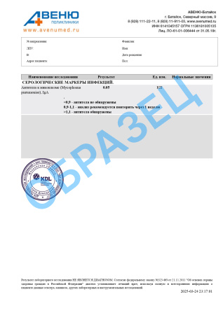 Разъяснение результатов анализов предоставляет важные сведения для доктора и не служит основанием для установления диагноза. Данные, полученные в ходе анализов, не должны применяться пациентами для самостоятельной диагностики или лечения. Окончательный диагноз определяется медицинским специалистом на основе комплексного анализа результатов данного исследования, а также истории болезни и данных из других диагностических процедур.