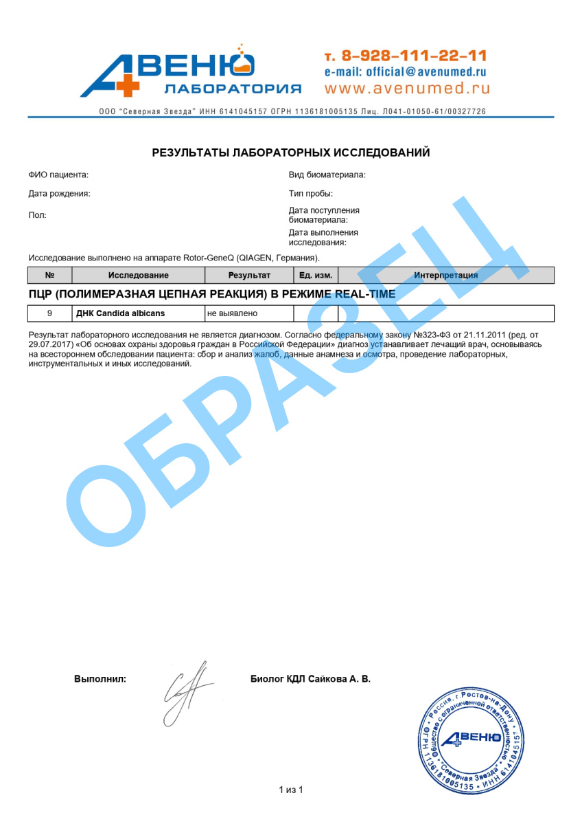 ДНК Кандида альбиканс в Ростове-на-Дону (Candida albicans, ПЦР), качественно
