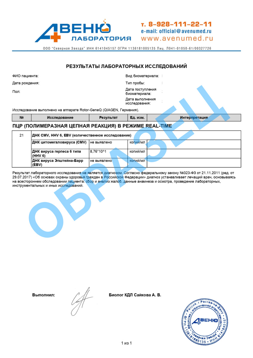 A26.05.011.002 Определение ДНК вируса Эпштейна-Барр (Epstein - Barr virus) методом ПЦР в периферической и пуповинной крови, количественное исследование