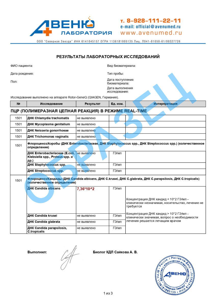 - Флороценоз – Кандиды: ДНК Кандида альбиканс, Кандида глабрата, Кандида Крузей, Кандида парапсилозис, Кандида тропикалс (Candida albicans, Candida glabrata, Candida crusei, Candida parapsilosis, Candida tropicalis, ПЦР), кол.
