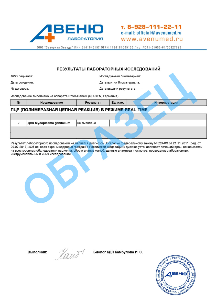 A26.21.031.001 Определение ДНК микоплазмы гениталиум (Mycoplasma genitalium) в отделяемом из уретры методом ПЦР