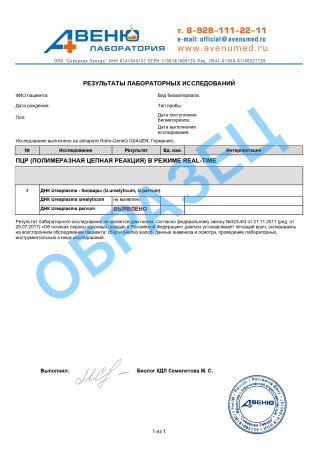 A26.21.027.001 Определение ДНК уреаплазм (Ureaplasma spp.) с уточнением вида в отделяемом из уретры методом ПЦР