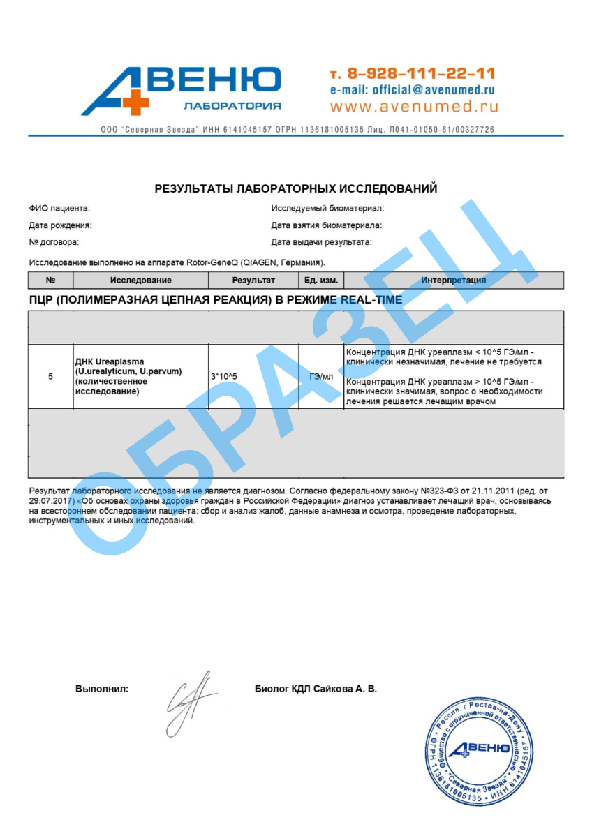 A26.28.019.002 Определение ДНК уреаплазм (Ureaplasma spp.) в моче методом ПЦР, количественное исследование
