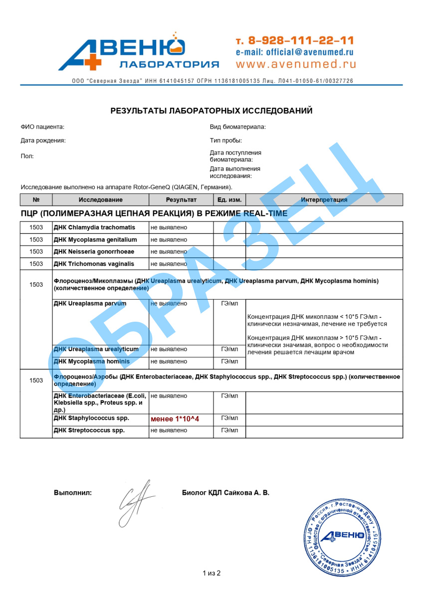 5. Флороценоз – Микоплазмы: ДНК Уреаплазма парвум, Уреаплазма уреалитикум, Микоплазма хоминис (Ureaplasma parvum, Ureaplasma urealyticum, Mycoplasma hominis, ПЦР), кол.