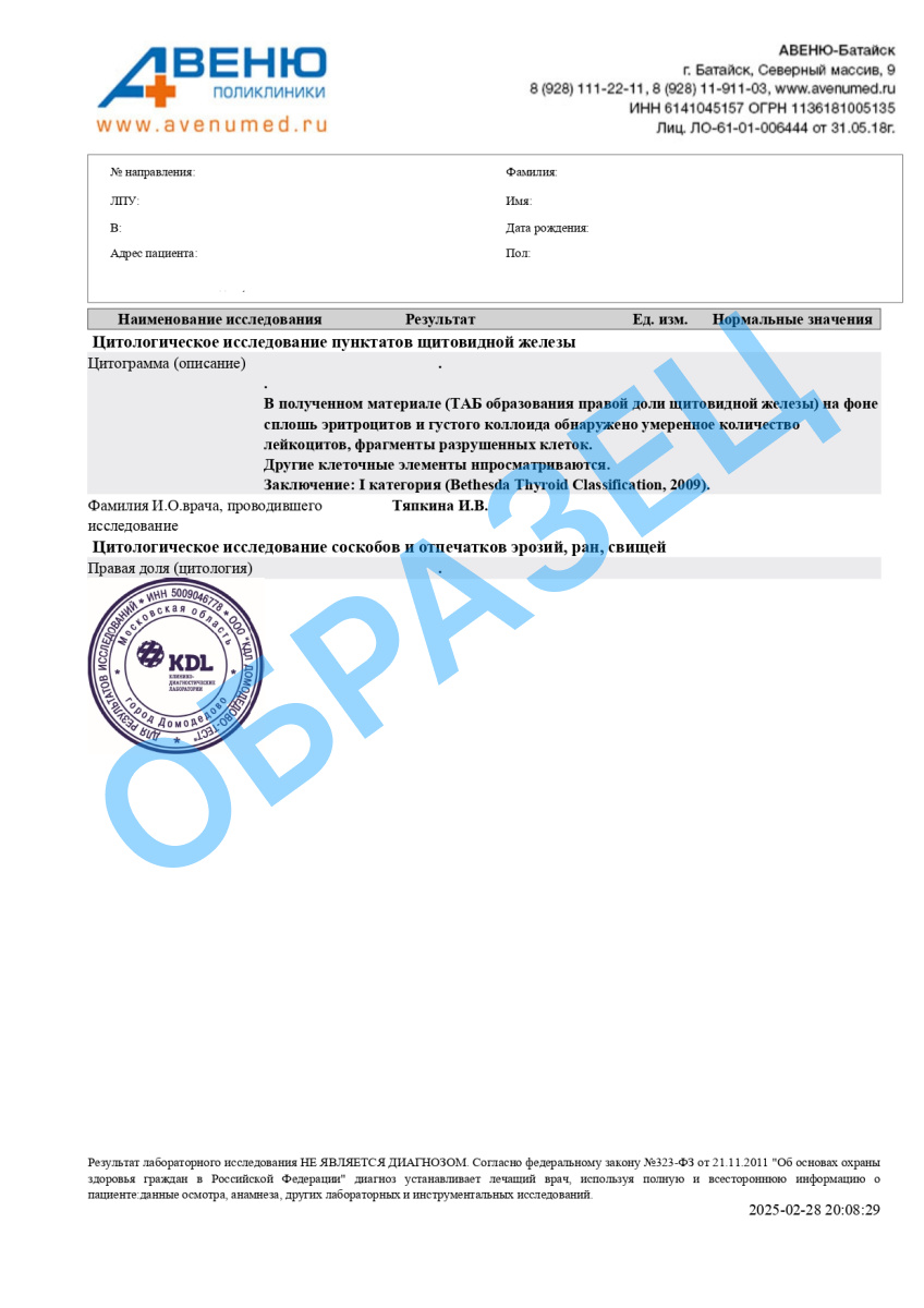 Цитологическое исследование пунктатов щитовидной железы (левая доля или правая доля или перешеек)