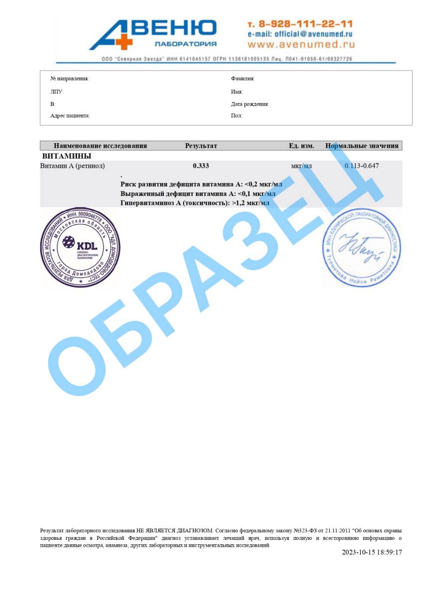 Выраженный дефицит витамина А фиксируется при значении менее 0,1 мкг/мл; Гипервитаминоз А, или токсичность, наблюдается при уровне выше 1,2 мкг/мл.