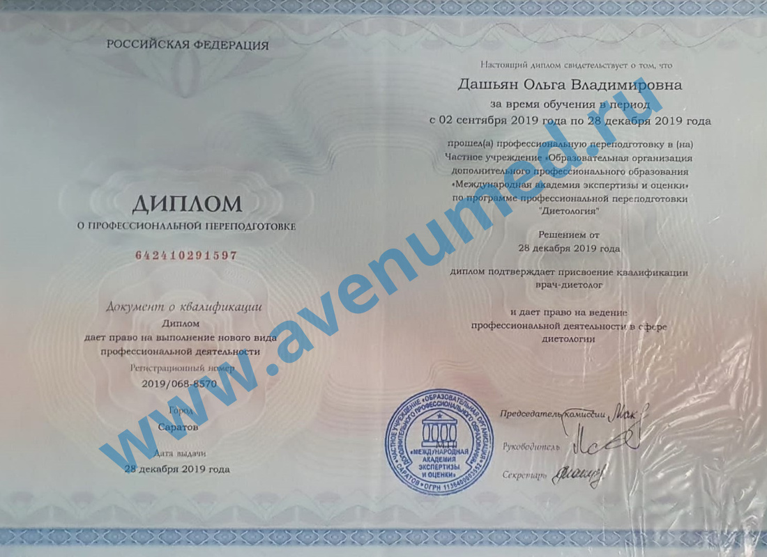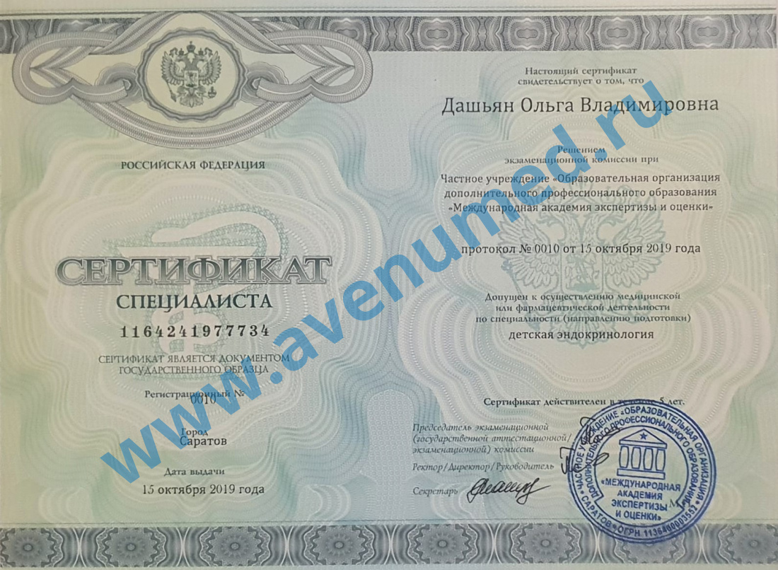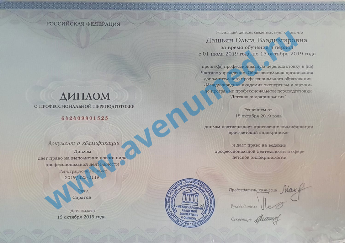 - 2019 г. - первичная переподготовка по детской эндокринологии