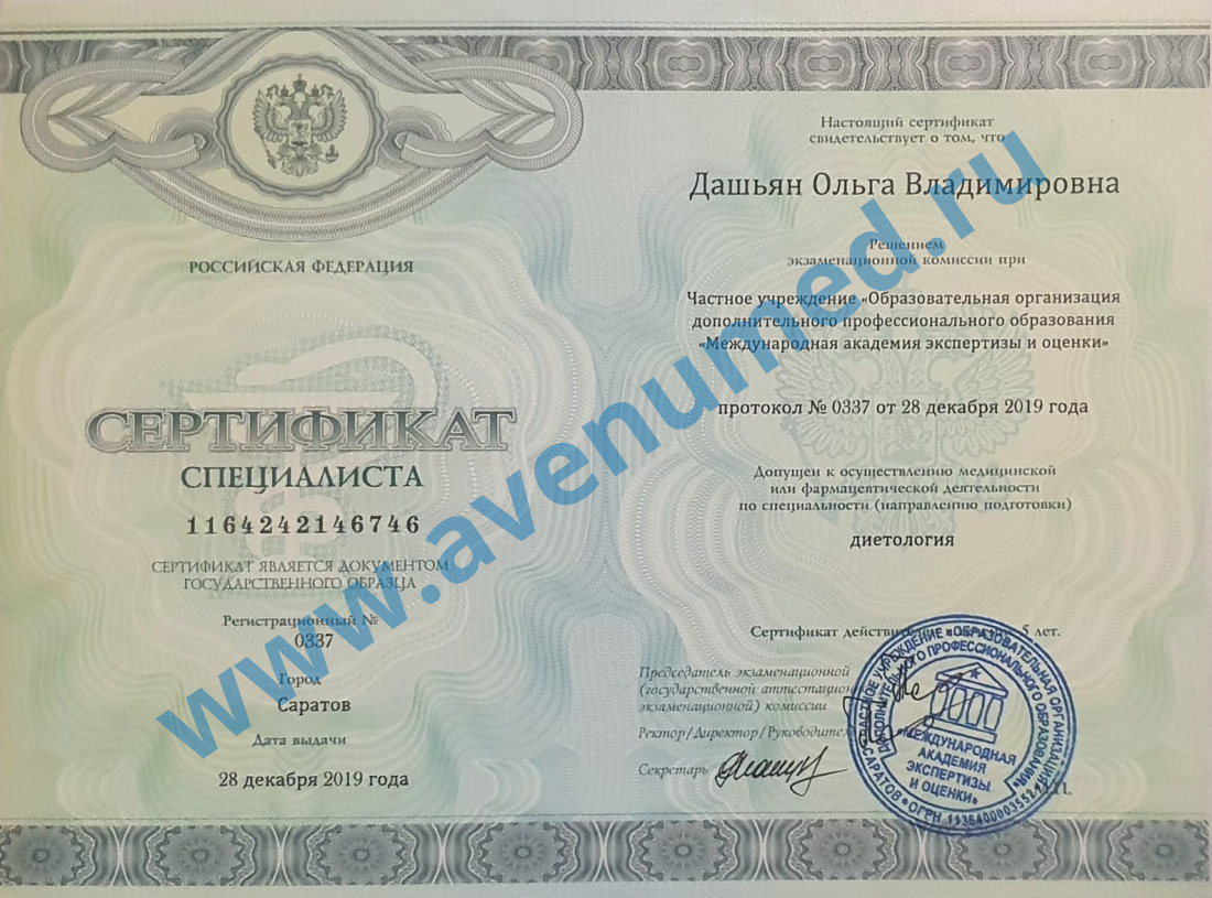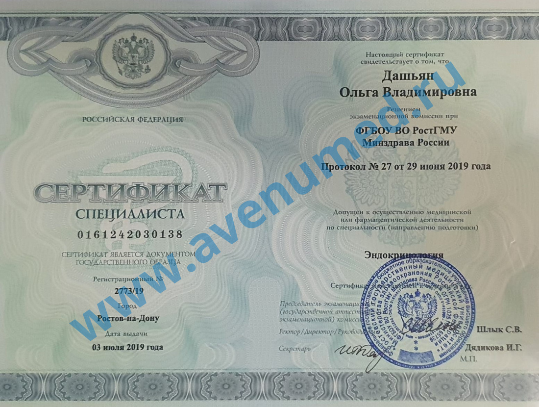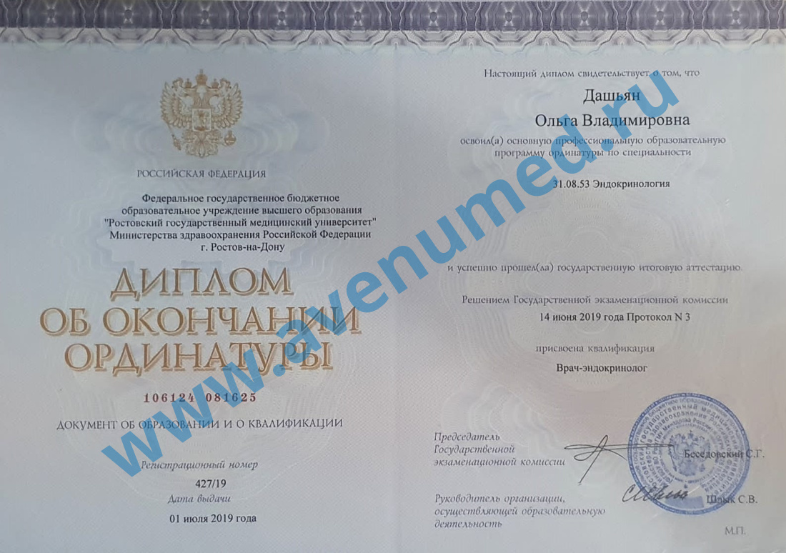 - 2019 г. - ординатура по специальности "Эндокринология", РостГМУ