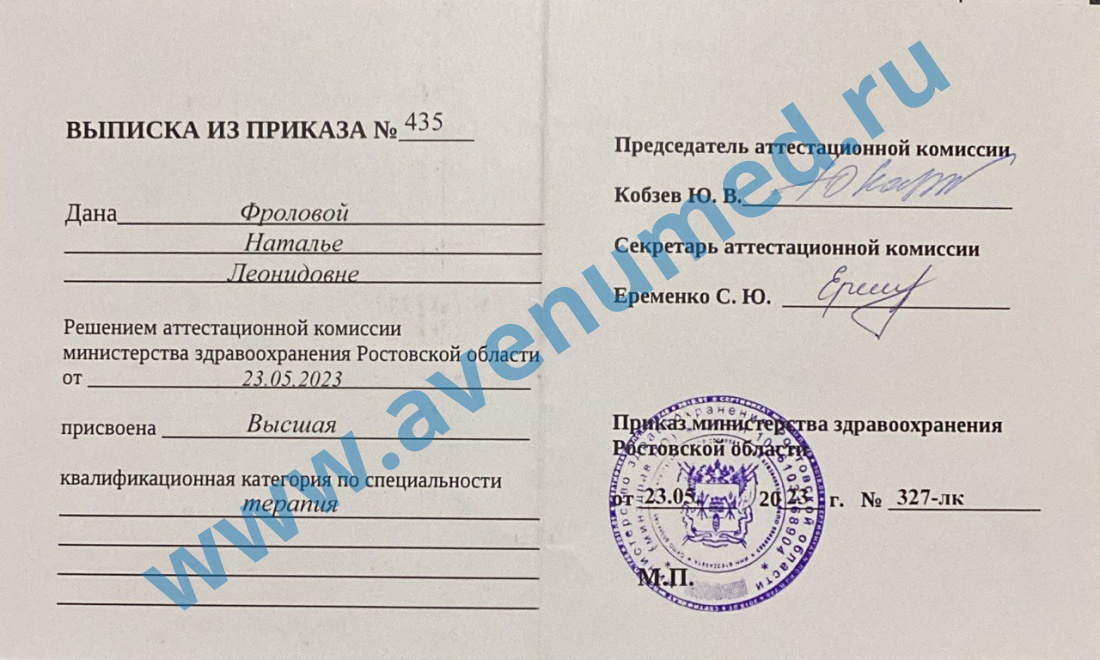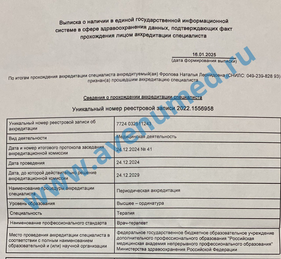 • 2015 г. - повышение квалификации по специальности "Терапия".