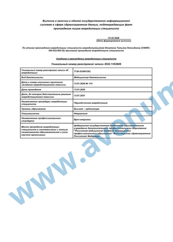 Хочу выразить огромную благодарность врачу-неврологу Игнатовой Татьяне Леонидовне. Обратилась я с жалобами на боль в спине и опущение правого века. Доктор внимательно выслушала меня, провела тщательный осмотр и назначила лечение. Благодаря профессионализму и внимательности доктора моё моральное и физическое состояние значительно улучшилось. Большое спасибо вам, доктор, за вашу работу! Побольше бы таких врачей!