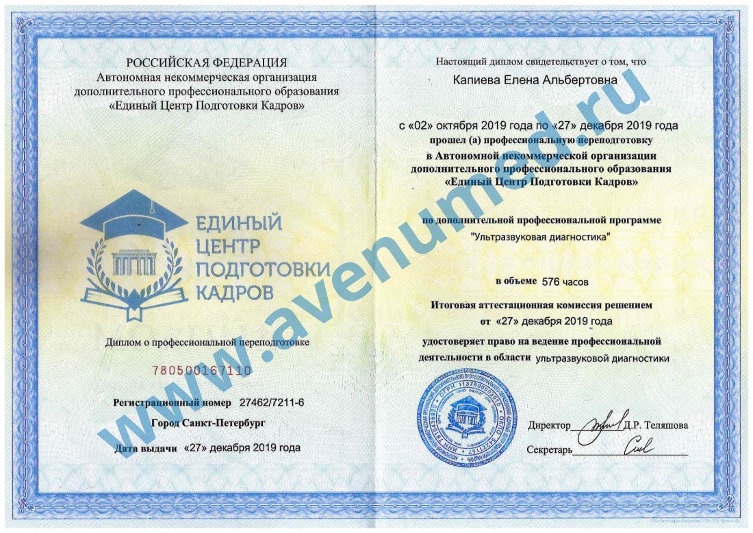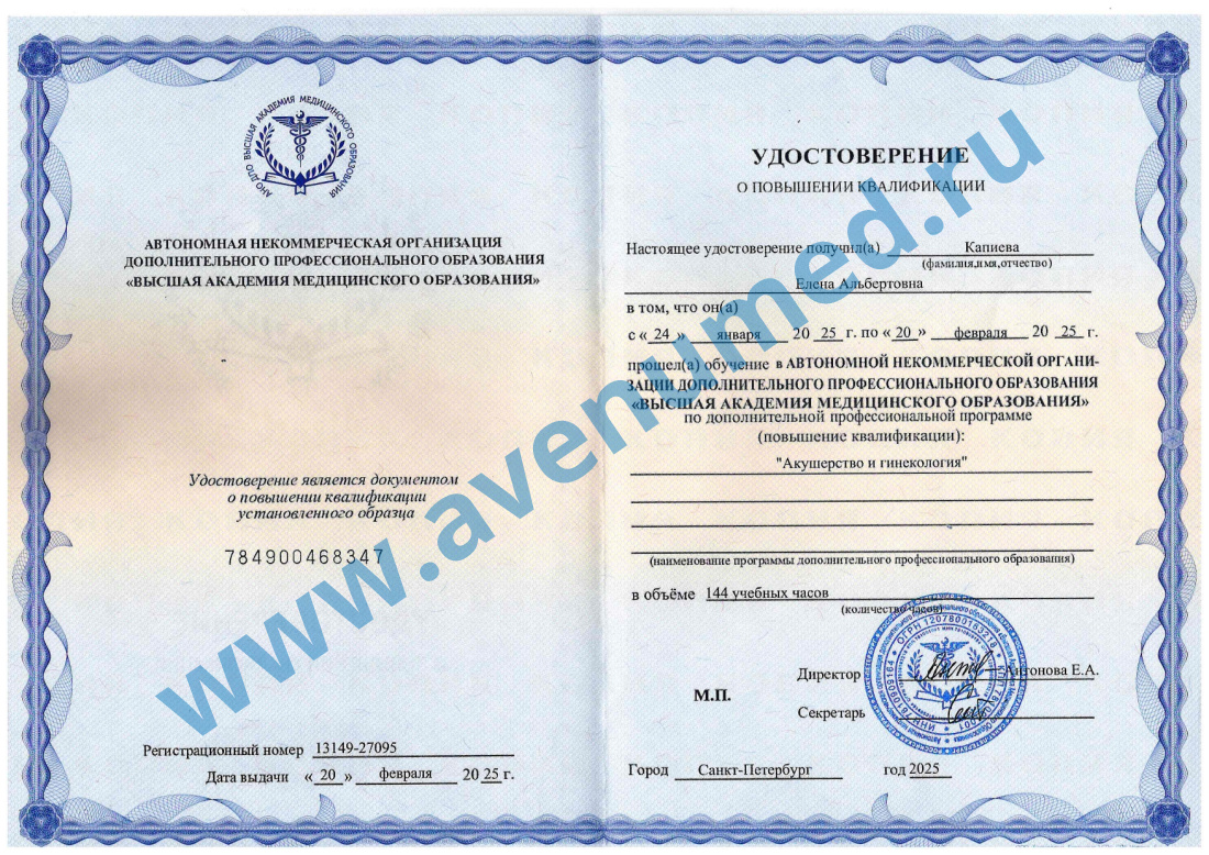 • 2016 г. - повышение квалификации по специальности "Акушерство и гинекология", Дагестанский государственный медицинский университет.