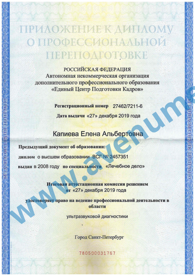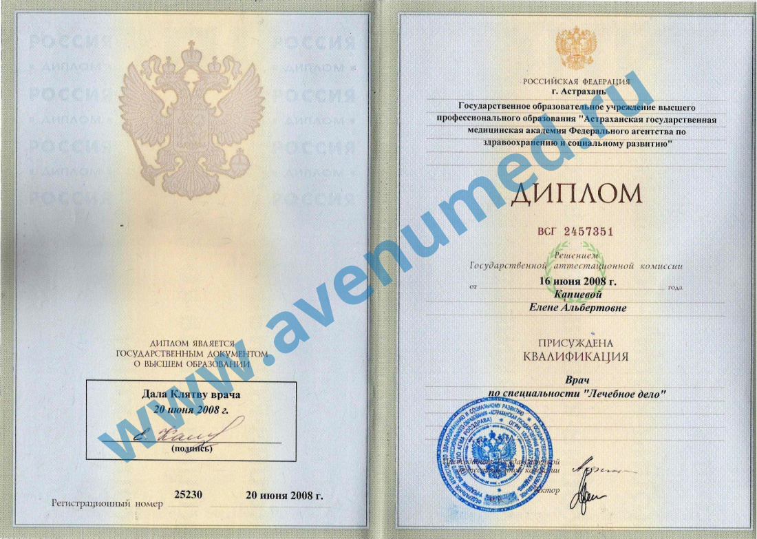 • 2008 г. - Астраханская государственная медицинская академия по специальности "Лечебное дело".