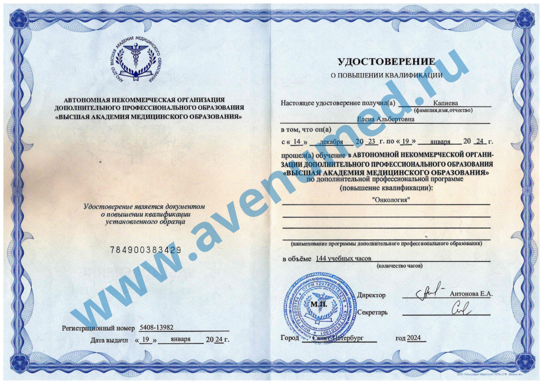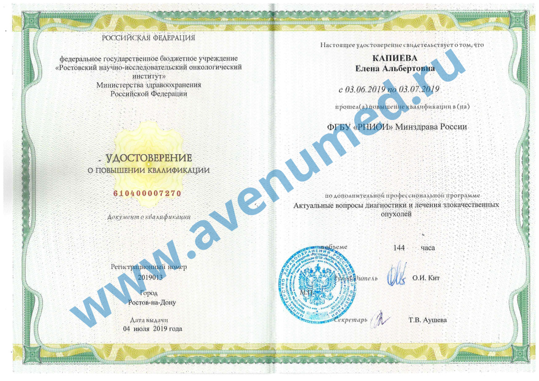 • 2020 г. - "Эндоскопические технологии в гинекологии", ФГБОУ ВО Дагестанский государственный медицинский университет.