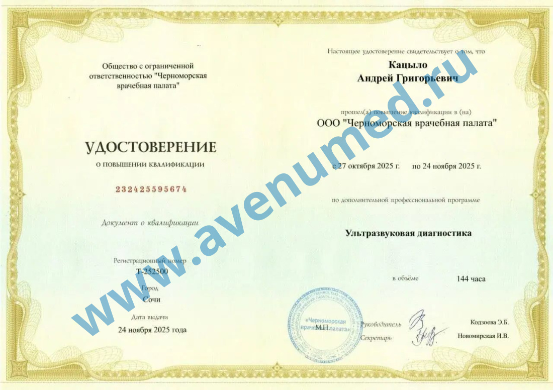 - 2017г. - «Ультразвуковая диагностика» АНО ДПО «Центральный многопрофильный институт» г. Москва