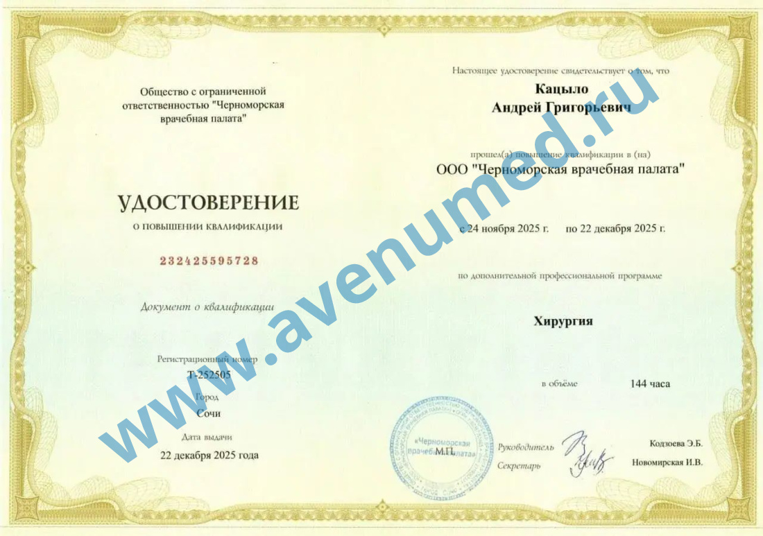 - 2014 г. - «Хирургия» Кубанский государственный медицинский университет г. Краснодар