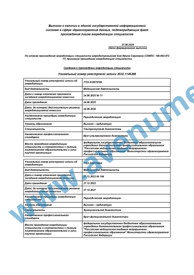 • 2020 г. - повышение квалификации по специальности "Ультразвуковая диагностика".