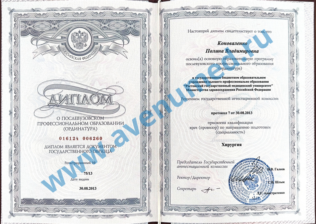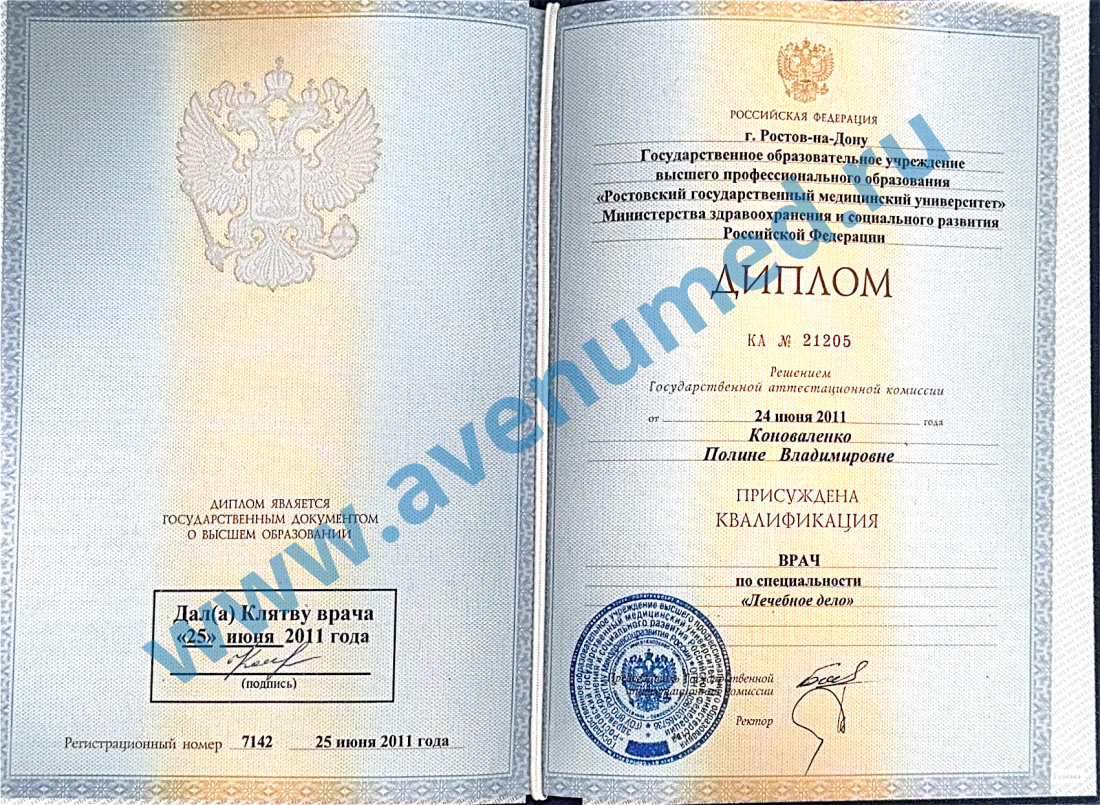 • 2011 г. - Ростовский государственный медицинский университет по специальности "Лечебное дело".
