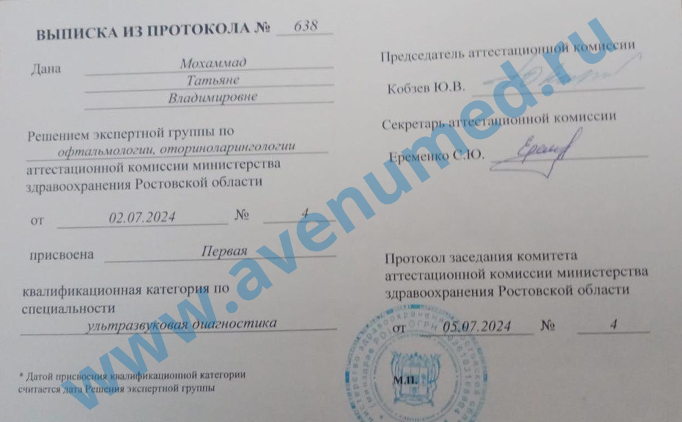 Высшая категория по гинекологии, первая категория по УЗИ