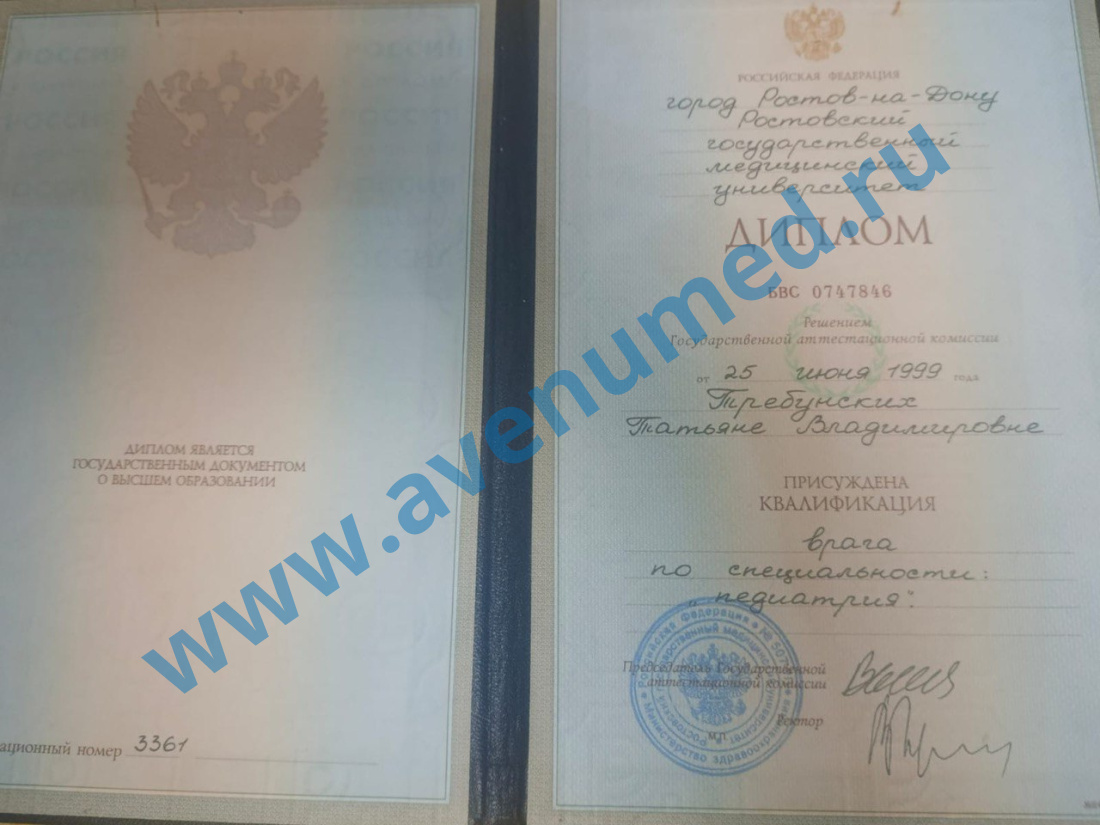 • 1999 г. - Ростовский государственный медицинский университет по специальности "Педиатрия".