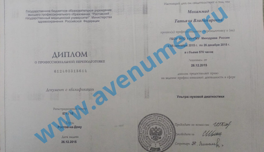 • 2015 г. - повышение квалификации по программе "Ультразвуковая диагностика".