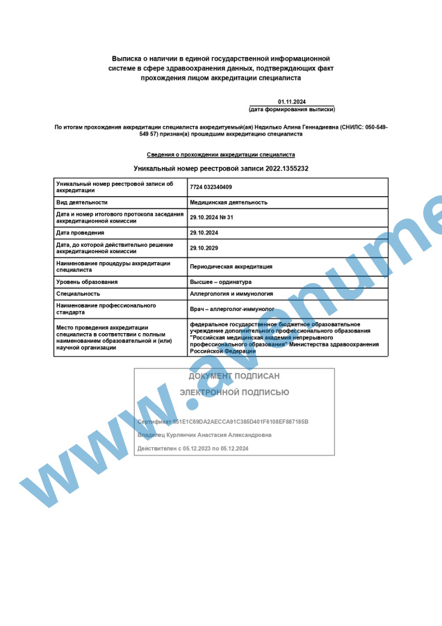 - 2009 г. - профессиональная переподготовка по программе "Аллергология и иммунология".