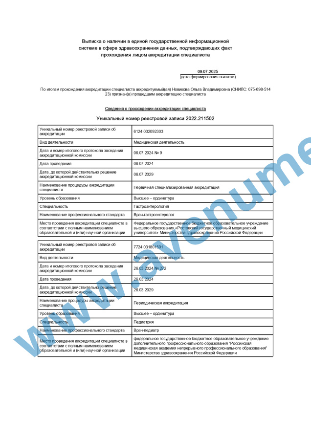 - 2024 г. - профессиональная переподготовка по программе "Гастроэнтерология", ФГБОУ ВО РостГМУ Минздрава России.