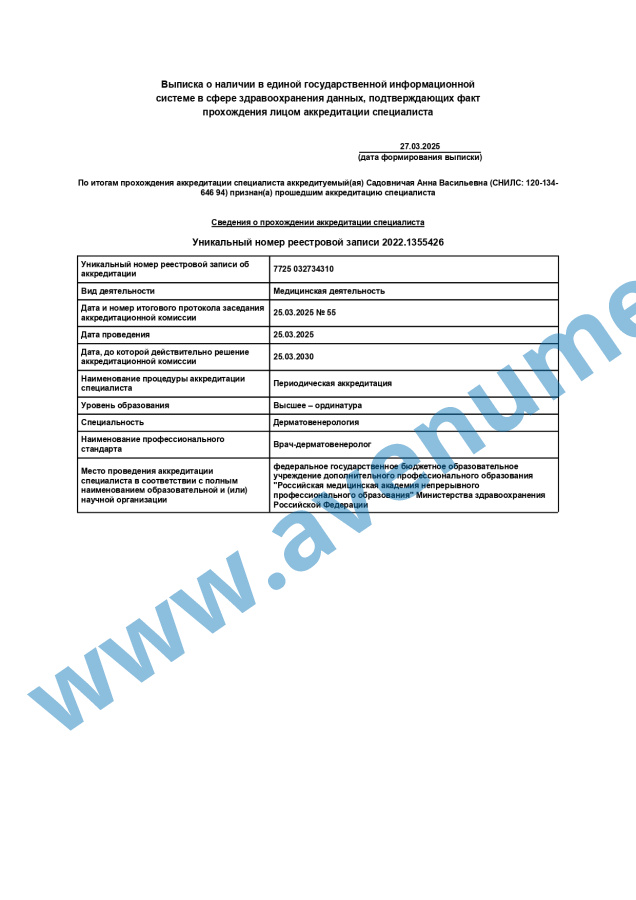 Анна Васильевна — настоящий профессионал своего дела, который искренне заботится о своих пациентах. Рекомендую всем, кто ищет квалифицированного и чуткого специалиста! Спасибо вам за вашу работу и заботу!
