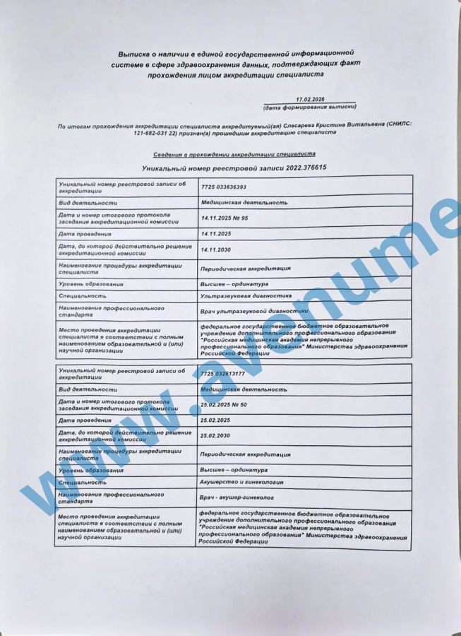 - 2018 г. – первичная специализация по Ультразвуковой диагностике на базе ФГБОУ ВО «РостГМУ» Минздрава России