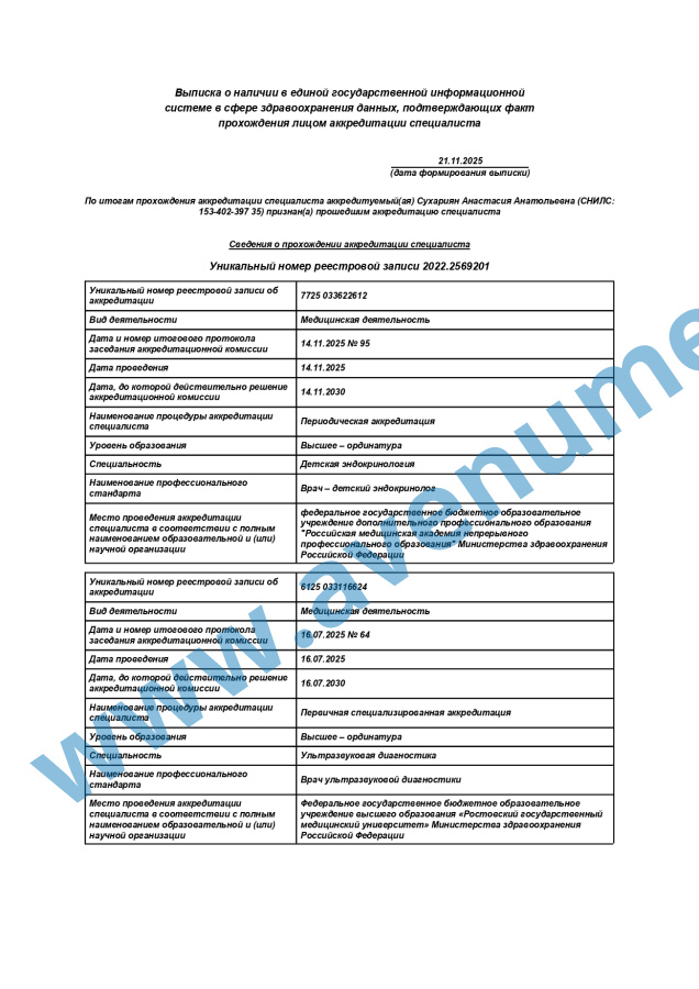 • 2020 г. - ординатура по специальности "Детская эндокринология".