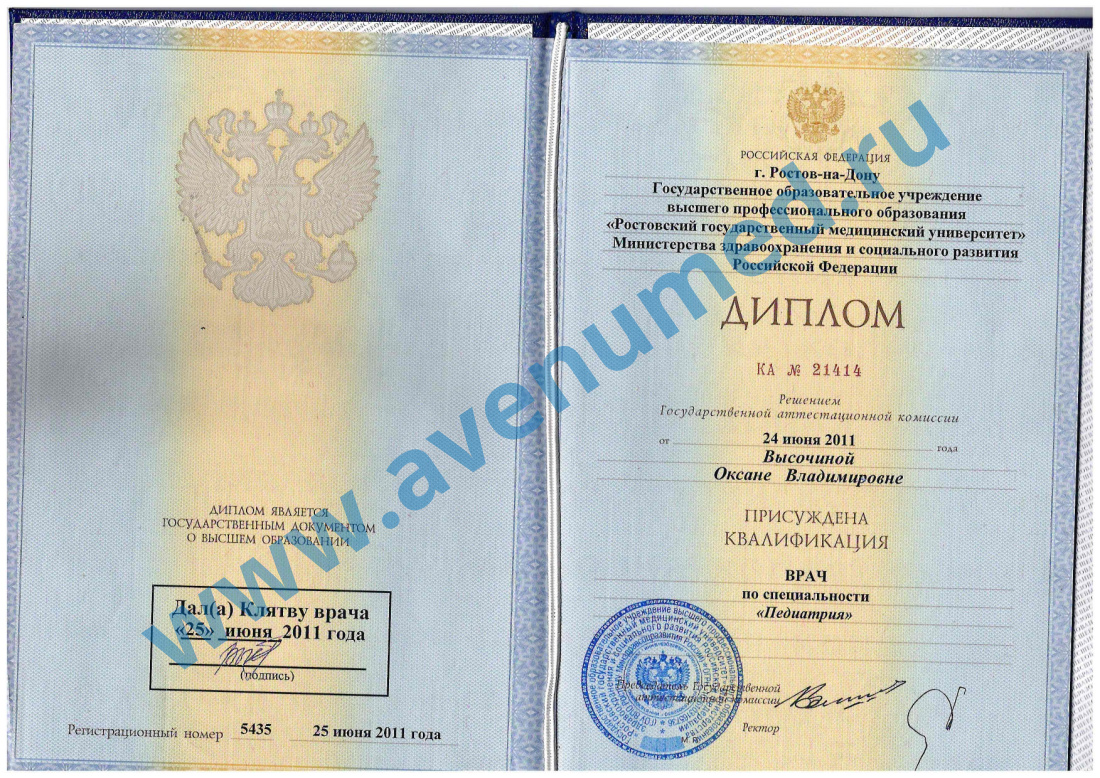 - 2011 г. - Ростовский государственный медицинский университет по специальности "Педиатрия".